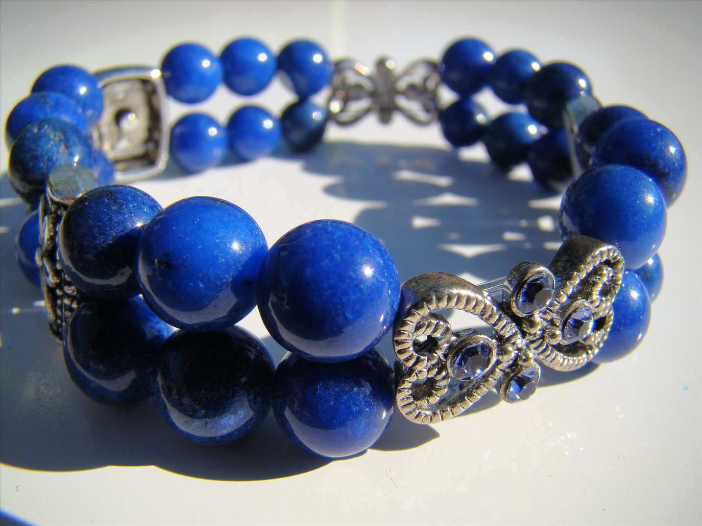 Handmade Double stand, Blue Jade bracelet with silvertone spacers with blue crystals. On stretch cord.