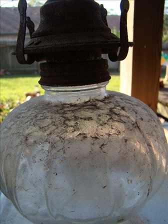 This dusty, rusty, glass Hurricane lamp can be used for props at your Theater productions. Missing globe.
