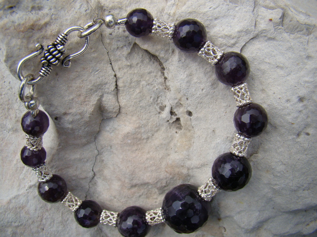 This stunning Amethyst Bracelet has graduating, facet cut beads with Sterling Silver Barrel Spacers and Clasp (8 1/2 inch in diameter.) It is said Amethyst is a semi-precious healing stone, beneficial and calming to the mind, facilitates decision-making….