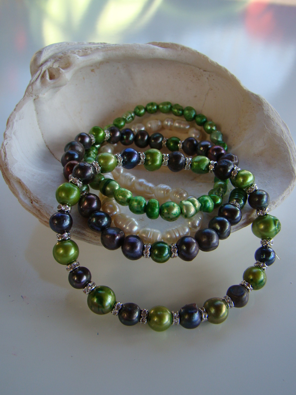 Pearl bracelets are in. Check out this multi-strand, set of four, fresh water pearls, strung on elastic cord for easy on and off. Crystals with goldtone spacers set off these pearls with a bling. Can be worn as singles or as a set. Each bracelet measures approx 8 in in diameter.